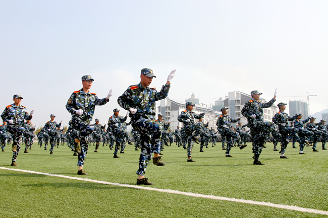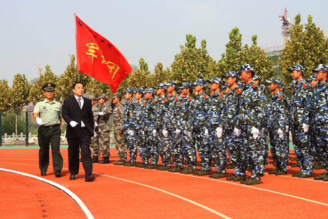 军训汇报在庄严的国歌中拉开序幕。1150余名新生组成的14个方队整齐列队,等待首长的检阅。史金飞校长在王如喜参谋长的陪同下,依次检阅各个方队。所到方队,受训学生整齐划一行注目礼,“首长好!”“为人民服务!”洪亮的口号在运动场四周回荡。