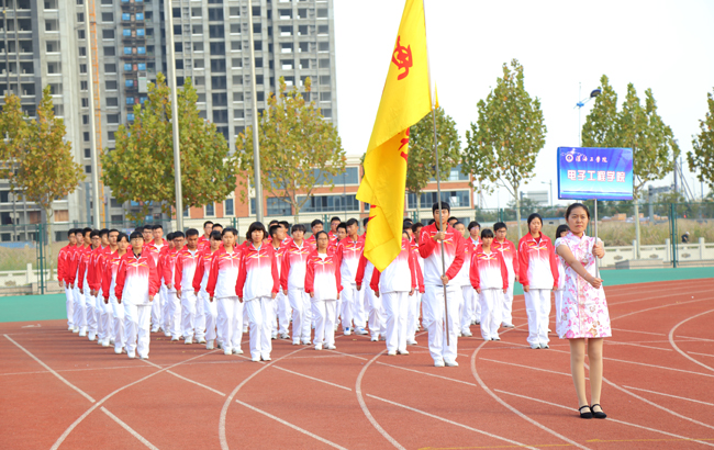伴随着激昂的乐曲声,由各个二级学院和校其他部门人员组成的26支代表方阵依次走过主席台前。首先走过主席台的是国旗仪仗队。作为方阵先锋,他们步伐稳健,整齐有序,鲜艳的红旗在风中飘扬与一身墨绿的军装相得益彰。