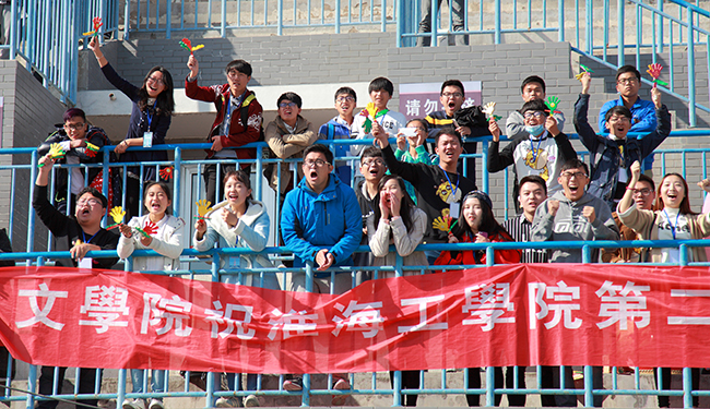 秋日午后阳光的威力依然不容小觑,但这丝毫不印象观众的热情。伴随阵阵擂鼓声,“土木加油!”的呐喊声响彻半空;“机械第一!”机械学院学生挥舞着“小手掌”,“啪啪”声伴随着呐喊声响彻运动场。“电子加油!”电子学院啦啦队也不甘示弱地加入其中。赛场已不仅仅是运动员的天下,也是观众席的比拼。阳光依旧,激情持续。