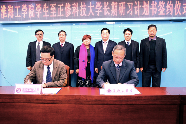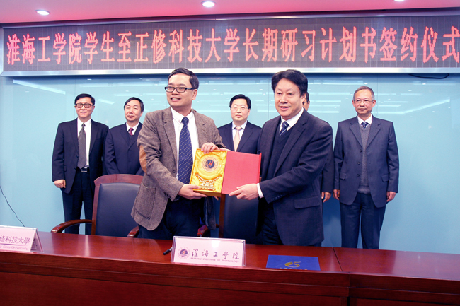 签约仪式上,赵晓江向正修科技大学捐赠授课钟点费,并与正修科技大学共同设立学生奖助学金用来资助我校学生赴正修科技大学进行学期交流。《淮海工学院学生至正修科技大学长期研习计划书》的签订,掀开了我校与正修科技大学合作交流的崭新篇章。