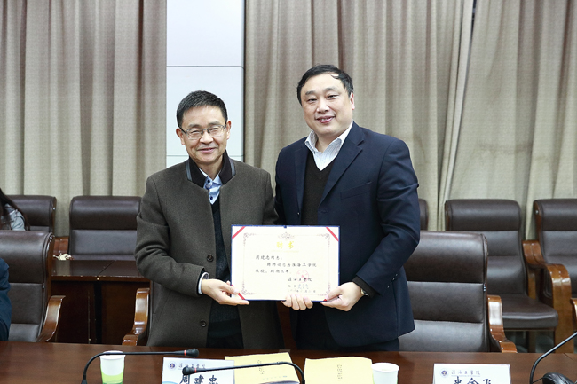 聘任仪式上,校长史金飞与周建忠教授签订聘任合同,向他颁发淮海工学院教授聘书。副校长舒小平致辞,对周建忠教授受聘我校表示热忱欢迎和衷心感谢。他指出,在淮海工学院积极推进江苏海洋大学创建过程中,周建忠教授的加盟对今后提升文科教育办学层次具有重要意义。他表示,学校将为“中国语言文学”学科建设和层次提升提供进一步支持,希望周建忠教授移植南通大学办学经验,为我校提高办学层次做出重要贡献。周建忠教授在答谢辞中衷心感谢学校领导对他的高度信任。他表示,今后将充分发挥沟通联系、资源整合和水平提升三方面作用,带领“中国语言文学”学科在全省乃至全国“进圈入围”,尽快在方向特色、项目课题、学术成果和科研奖项等方面开创新局面。