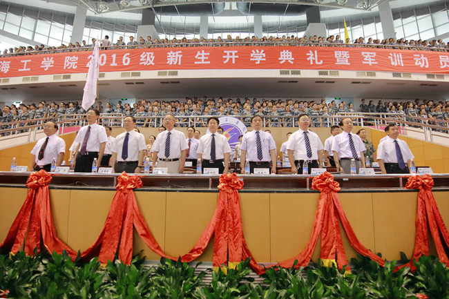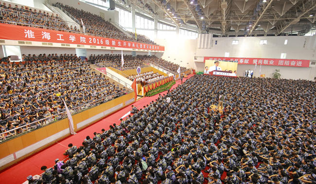 9月6日上午,淮海工学院2016级新生开学典礼在苍梧校区体育馆隆重举行。校领导赵炳起、史金飞、刘永强、宁晓明、史顺良、舒小平、杜军、许兴友、王洪法出席典礼。各二级学院党政负责人、有关职能部门负责人、新生班主任、辅导员和全体2016级新同学参加了开学典礼。开学典礼由副校长王洪法主持。