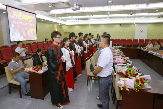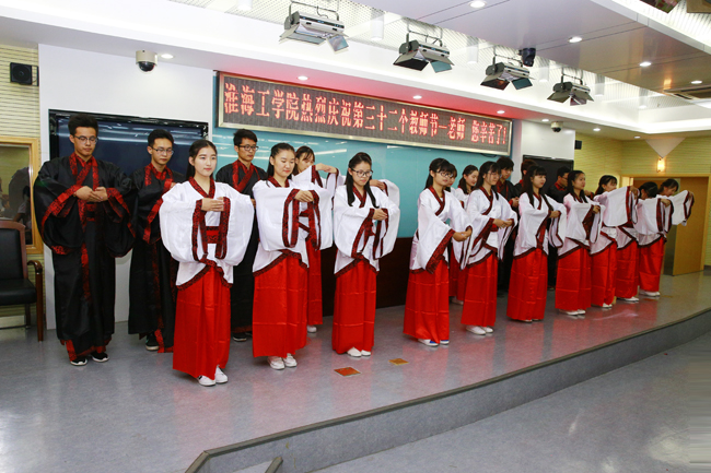 会上,副校长刘永强宣读表彰名单。校领导为江苏省教育工作先进集体、淮海工学院2016年“师德建设月”活动先进单位,以及江苏教育先进个人、江苏省第五期“333工程”第三层次培养对象、“青蓝工程”中青年学术带头人、“青蓝工程”优秀青年骨干教师、连云港市教学名师等先进集体和个人颁奖。随后,身着汉服的同学向恩师敬谢师茶、行谢师礼。