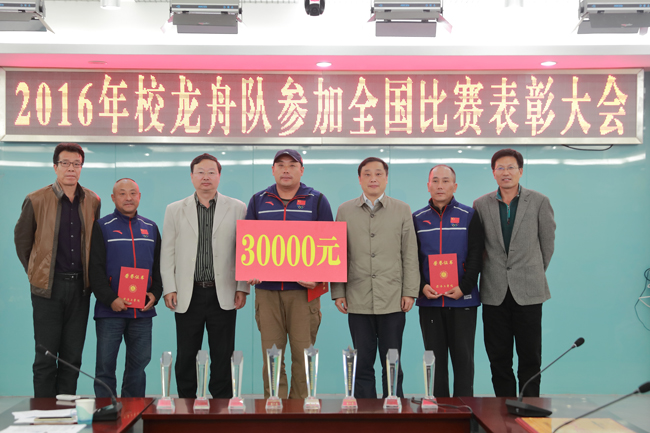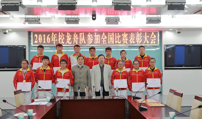 2016年校龙舟队参加全国比赛获得优异成绩,10月26日下午,表彰大会在会议中心东海厅隆重举行。校领导史金飞、宁晓明出席会议,教务处、学生处、团委、体育学院等部门负责人以及校龙舟队教练员、运动员参加表彰大会。