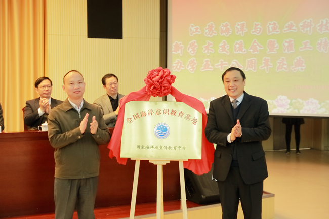 仪式上,国家海洋局宣传教育中心公众教育处副处长邵文台宣读在我校设立全国海洋意识教育基地的决定。校长史金飞与国家海洋局宣传教育中心副主任王忠为基地揭牌。基地将依托我校海洋馆、涉海科研平台等资源,发挥学校人才和智力优势,在普及海洋知识、塑造海洋文化、弘扬海洋精神、增强公众海洋意识等方面开展宣传教育活动。