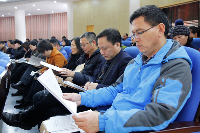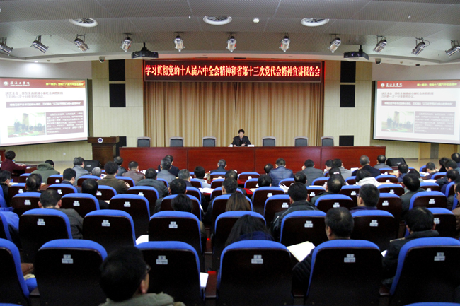 12月2日下午,我校在会议中心黄海厅召开学习贯彻党的十八届六中全会精神和省第十三次党代会精神宣讲报告会。校党委书记赵炳起传达了党的十八届六中全会和江苏省第十三次党代会精神,并就我校贯彻落实提出要求。校领导史金飞、刘永强、宁晓明、史顺良、杜军、王洪法出席会议。