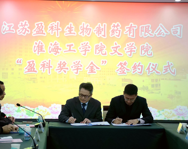 12月25日下午,江苏盈科生物制药有限公司与淮海工学院文学院在会议中心东海厅隆重举行“盈科奖学金”签约仪式。副校长、校友总会会长刘永强,我校文学院94级校友、江苏盈科生物制药有限公司董事长李海,江苏盈科生物制药有限公司副总经理许建明出席仪式,校友总会、发展规划处、学生处等部门负责人及文学院党政负责人、师生代表参加仪式。