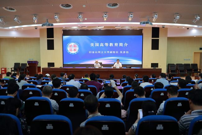 随后,吴彦伯博士在会议中心黄海厅为我校教师开展了主题为《美国高等教育简介》的学术讲座。吴彦伯博士从核心理念、教育系统、大学运作、挑战与前瞻等几个方面为大家详细介绍了美国高等教育的历史、发展与成就以及现阶段面临的问题。吴彦伯博士还现场解答了几位老师提出的有关美国高校研究项目、学术委员会职责、学术休假等方面的具体问题,使大家对美国高等教育有了更直观的了解。讲座由校党委副书记、副校长宁晓明主持,全校中层干部、系正副主任、专业负责人以及相关学院的教师参加了此次讲座。