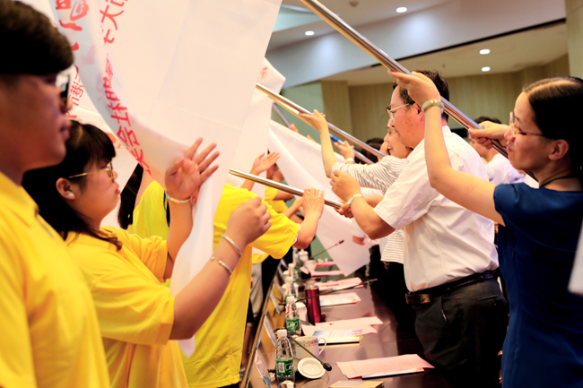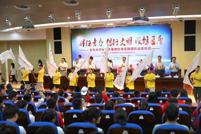 6月27日,连云港市“挥洒青春·倡行文明·服务基层”全市百支暑期社会实践团队出征仪式暨我校社会实践启动仪式在苍梧校区会议中心黄海厅隆重举行,连云港市委常委、宣传部长滕雯,团市委书记曹明丽,市文明办副主任吴克典、市委教育工委副书记田文瑞、团市委副书记仲伟德,我校党委副书记、副校长宁晓明,副校长王洪法出席会议,市委宣传部副部长周玉久主持会议,全市大中专院校师生代表300余人参加了出征仪式。