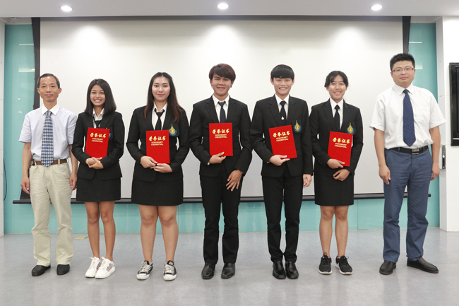 典礼上,校党委副书记、副校长宁晓明、学生处处长汤洪涛、教务处副处长孙国红、文学院党委书记马恒民、团委书记朱国军为留学生颁发2017泰国留学生优秀学员证书。宁晓明为留学生颁发结业证书,并与留学生们合影留念。