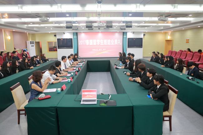 7月7日下午,我校2017泰国留学生班结业典礼在会议中心东海厅举行。校党委副书记、副校长宁晓明以及国际交流与合作处、教务处、学生处、文学院、团委等部门负责人出席本次典礼,泰国留学生班全体学员、班主任、任课老师代表和学生志愿者代表参加了典礼。典礼由国际交流与合作处处长徐岚主持。