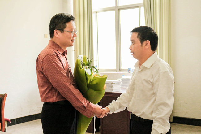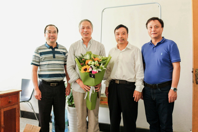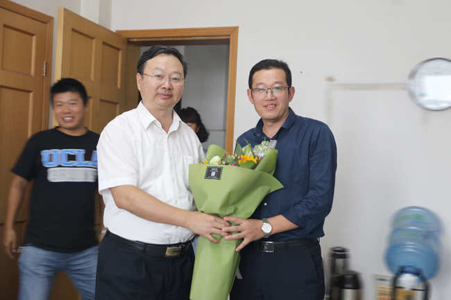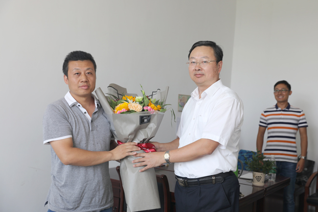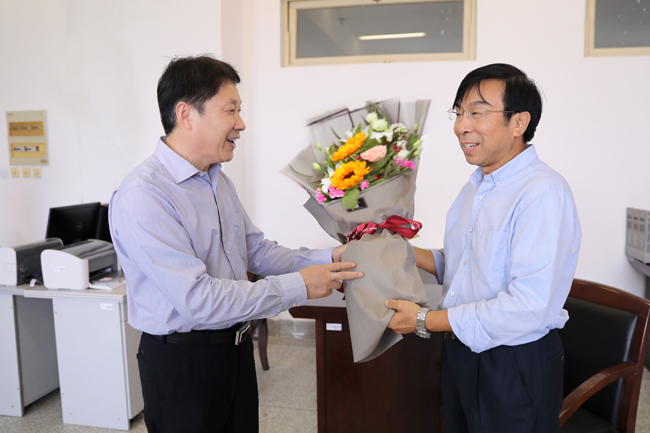 许兴友随后来到理学院,看望了2014—2016学年“优秀辅导员”获得者洪海老师。洪老师已近60岁,始终不忘初心、坚守辅导员工作岗位,长期默默无闻奉献在教育一线,做广大青年学生的人生引路人。许校长对长期以来洪老师对学校的突出贡献表示感谢,希望他为学校发展积极建言献策,并向他送上教师节的祝福。