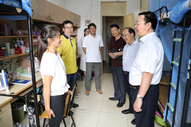 为了做好新生入学各项工作,学校学生工作部门特意制作了大一新生大数据,里面既有生源省市分布情况,还有新生最高身高、最小年龄、家庭经济情况等相关细微数据。校领导一行先后来到通灌校区和苍梧校区学生宿舍区,根据大数据提供的情况,分类慰问了家庭经济困难学生、离家最远新生、年龄最小学生、“史上最高”学生,并专门走访了开学前为学校发展建言献策的新生家长。