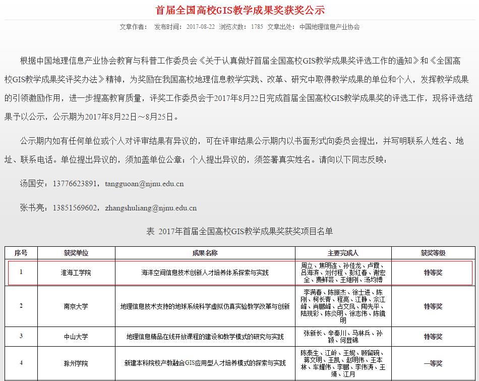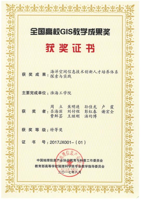 日前,由中国地理信息产业协会教育与科普工作委员会、教育部高等学校地理科学类专业教学指导委员会主办的中国GIS教育论坛在北京国家会议中心举行,会议表彰了南京大学、中山大学等全国22所高校在我国高校地理信息教育教学改革实践中取得的教学成果。我校测绘与海洋信息学院周立教授申报的《海洋空间信息技术创新人才培养体系探索与实践》获得首届全国高校GIS教学成果特等奖。
