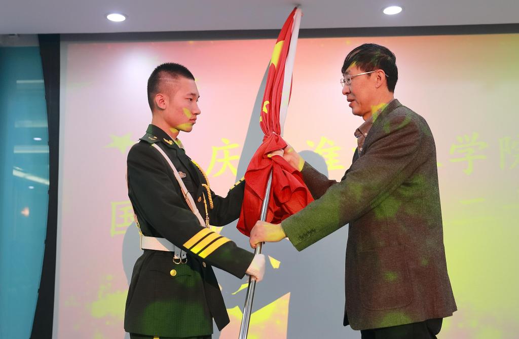 副校长杜军为国旗队授旗,第21届队长郑重接过红旗,并让它高高飘展,身着军装的队员面向国旗肃穆敬礼。