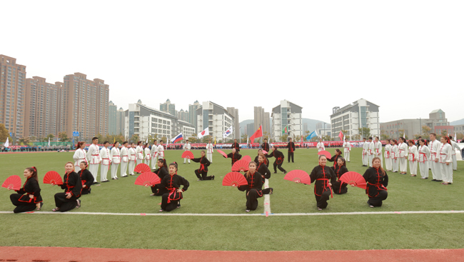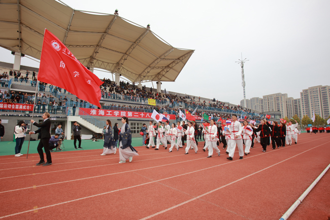 与往年不同,今年校运会组委会在开幕式之前精心安排了暖场表演。伴随着主持人慷慨激昂的介绍,一条金龙从操场左侧腾跃而出。来自体育学院休闲体育专业的52名同学手举长龙,成列奔跑在操场中央,长龙随着他们的动作不断升腾、盘旋,时而抬头直冲云霄,时而蜿蜒潜入海底,精彩的演出令现场观众赞叹不已,纷纷拍照录像。来自韩国、日本、巴基斯坦、吉尔吉斯斯坦、俄罗斯等国的留学生们以剑术配合扇舞进行表演,并用毛笔现场书写“明月入淮、千里同好”八个大字,表达了留学生们对淮海园、对中国文化的喜爱之情。随后进行的健身操表演、绸扇表演、高脚表演等节目,不仅让观众们眼前一亮,也展示了我校师生热爱运动、拼搏奋进的风采。