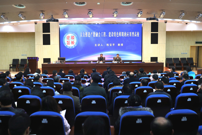11月29日下午,学校特邀原徐州工程学院院长、二级教授、博士生导师、教育部学校规划建设发展中心“高等学校产教融合创新试验”项目首席专家韩宝平做客“校长论坛”,在会议中心黄海厅作了题为《大力推进产教融合工程,建设特色鲜明的应用型高校》的专题报告。报告会由校长宁晓明主持。
