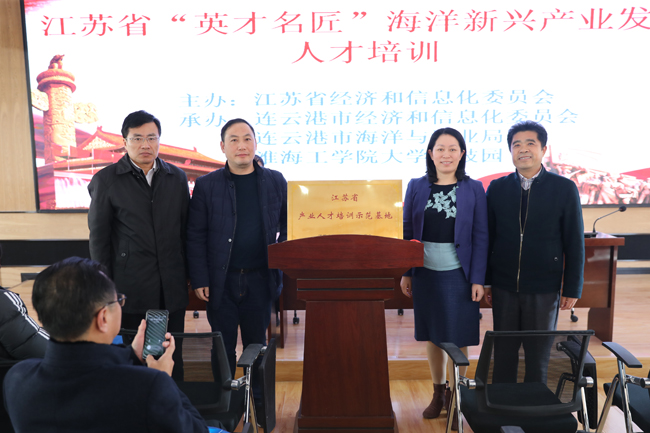 12月4日上午,江苏省“英才名匠”产业人才培训暨“江苏省产业人才培训示范基地”揭牌仪式在我校举行。副校长杜军、江苏省经济和信息化委员会教育培训处主任尹涛、连云港市经济和信息化委员会副主任冯燕芹、连云港市海洋与渔业局副局长薛学坤,淮海工学院大学科技园管委会主任、总经理纪延光,以及来自海洋企业、涉海类机关单位和相关产业的代表共60余人参加了揭牌仪式。