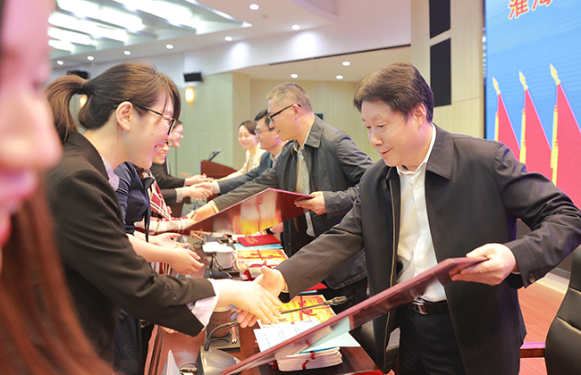 金芙蓉宣读了《关于表彰淮海工学院2017年度五四红旗团委、共青团工作先进工作者、五四红旗团支部、优秀团干部、优秀团员的决定》。本次共计表彰校五四红旗团委8个、共青团工作先进工作者8位、五四红旗团支部49个、优秀团干部326名、优秀团员767名、年度“十佳大学生”10名。