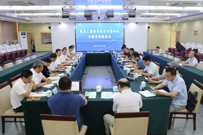 由浙江海洋大学张兆德教授担任组长的设备验收专家组,首先听取了承建单位中船重工702研究所对海洋工程技术综合实验中心设备的设计、制造、安装测试情况的说明。随后,各位专家和与会人员来到海洋工程技术综合实验中心现场,对仪器设备的运行情况进行了考察,并就实验设备的完整性、实验数据的可靠性和仪器的维护保养资料等进行了质询。