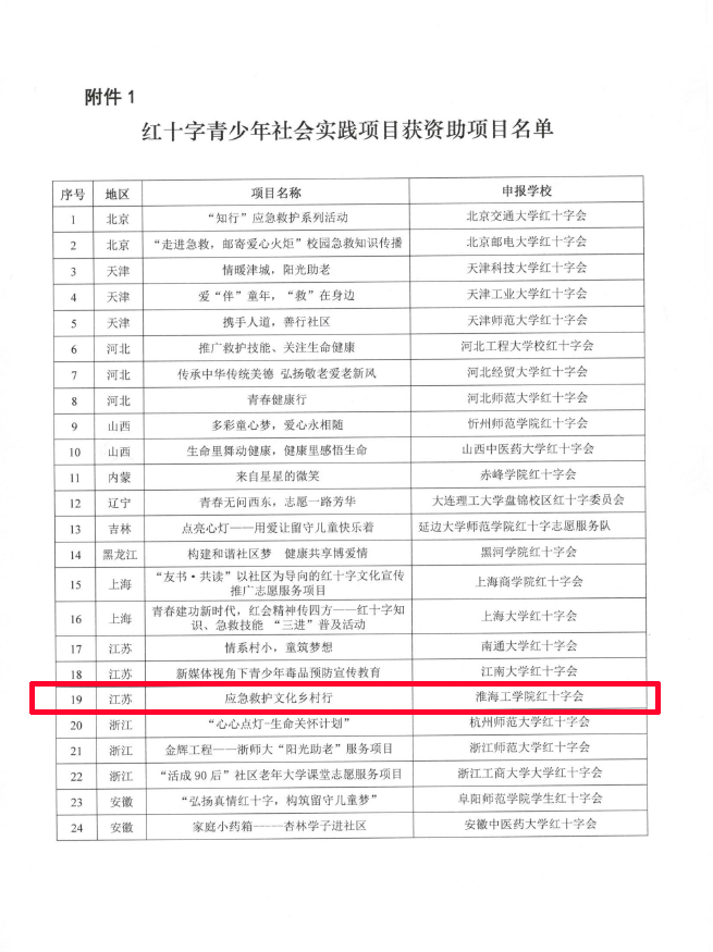 近日,中国红十字总会发布《关于2018年红十字青少年社会实践项目评选结果的通知》,我校艺术学院申报的“应急救护文化乡村行”获准立项。该项目是我校承担的第一个国家级红十字社会实践项目,也是连云港市承担的第一个国家级红十字社会实践项目。