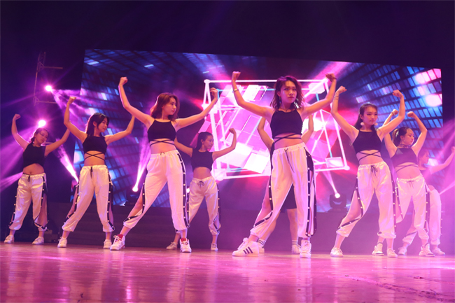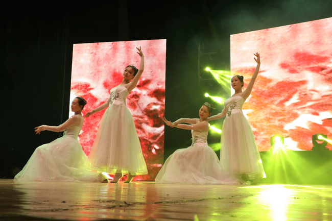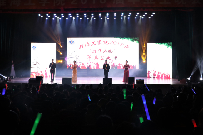 大屏幕播放了一段视频,用毕业生们或俏皮或严肃的照片唤醒了他们大学四年的点滴回忆。随后,开场舞《春天的芭蕾》吸引了全场观众的目光,充满青春活力的民舞队员踏着律动感十足的节拍来到舞台前,曼妙的舞姿点燃全场激情;由李淑华老师、姬徐田子老师、王号越等同学献上了师生串烧联唱,引得现场观众高呼尖叫,掀起晚会小高潮;艺术团劲舞队的舞蹈《Confident》尽显青春活力、海之声合唱队《我“淮”念的》带领观众们走进回忆的殿堂,让人热泪盈眶;由退伍大学生代表带来的擒拿表演《好男儿》,尽显男儿本色,雄壮的背景音乐配合同学们的精彩表演,激起青年学子对绿色军营的向往;国标舞表演《启程》表达了学校对所有毕业生的祝福,歌曲演唱《一次就好》《知足》带领全场观众进入幸福的小幸运里;海之影模特队的表演《花样年华》,俊男靓女依次亮相,现场观众尖叫连连;郭戈老师一首意大利歌曲《一步之遥》,配合着惊艳的探戈将晚会推向高潮……最后,晚会在《我爱这蓝色的海洋》的合唱中落下帷幕。