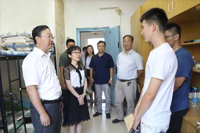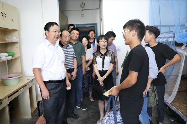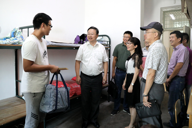 9月1日,是今年新生报到的“正日子”。当天下午,校长宁晓明、副校长金芙蓉,顶着烈日,先后前往苍梧校区、通灌校区新生宿舍,亲切看望慰问部分2018级新生,并为他们送去生活用品和慰问金。
