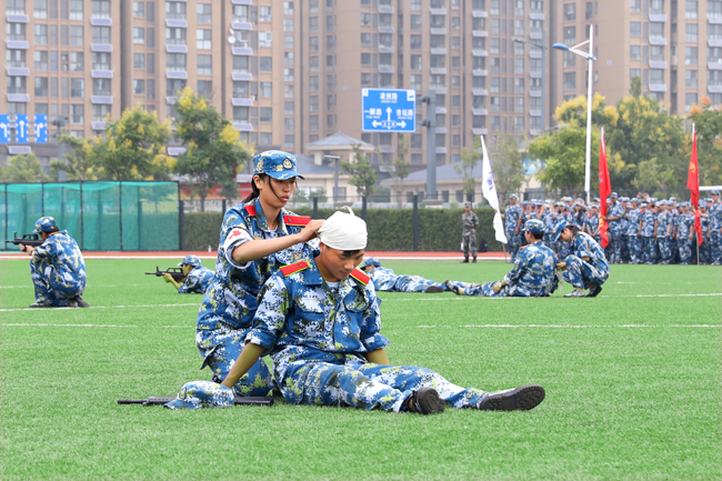 军训学员战地救护表演