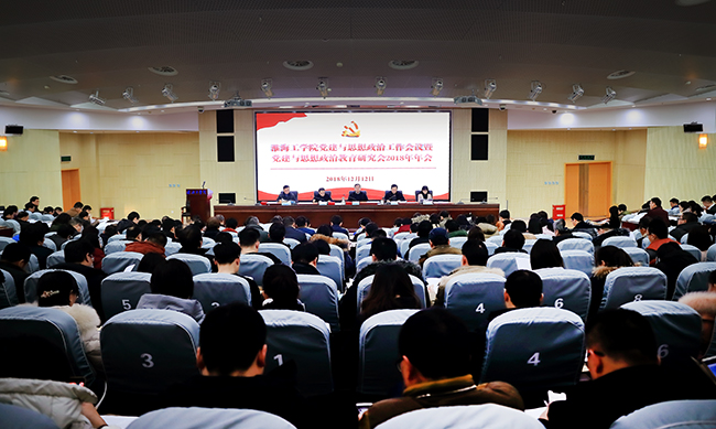 学校党委深入学习贯彻全国高校思想政治工作会议精神,制定了《淮海工学院关于加强和改进新形势下思想政治工作的实施办法》,提出了一系列具体举措。召开了全校思想政治工作会议,部署进一步加强和改进学校思想政治工作的主要任务。成立党委教师工作部,加强教职工思想政治工作和师德师风建设。成立社会科学处,增强哲学社会科学育人功能。召开第七次教学工作会议,进一步推进“课程思政”工作。
