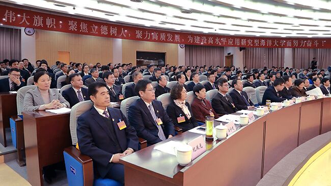 本次大会主题是:以习近平新时代中国特色社会主义思想为指导,深入贯彻党的十九大和全国教育大会精神,立足新时代,顺应新形势,把握新要求,团结带领全校师生员工,以全面提升人才培养质量为核心,以扎实推进博士学位授予单位立项建设为契机,以稳规模、调结构、提质量、增效益、强特色为重点,聚焦立德树人,聚力高质发展,为建设高水平应用研究型海洋大学而努力奋斗。