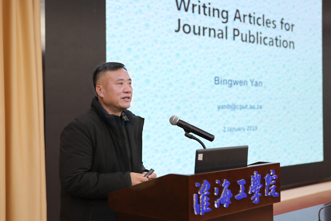 仪式结束后,颜炳文教授为我校师生作题为《Writing Articles for Journal Publication》的报告。他从论文的重要性、科研论文的组成、英文写作存在的问题、如何投稿等几个方面结合案例对英文论文写作进行了深入浅出的阐释,精彩的报告博得现场师生阵阵热烈的掌声。报告结束后,颜炳文还与师生们进行了互动交流。
