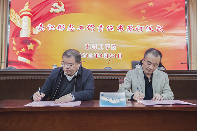 为全面落实意识形态工作责任制,4月24日下午,我校在会议中心黄海厅举行2019年度意识形态工作责任书签订仪式。