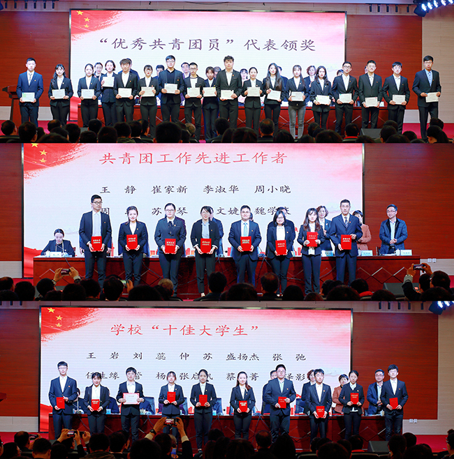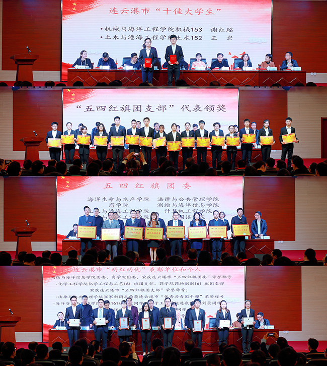 本次共计表彰校五四红旗团委8个、五四红旗团支部57个、共青团工作先进工作者8位、优秀团干部334名、优秀团员811名,与会领导依次为获奖集体和个人颁发了荣誉证书。连云港市“十佳大学生”、市级五四红旗团委、五四红旗团支部、优秀共青团干部、优秀共青团员、校“十佳大学生”也在本次大会上一并颁奖表彰。
