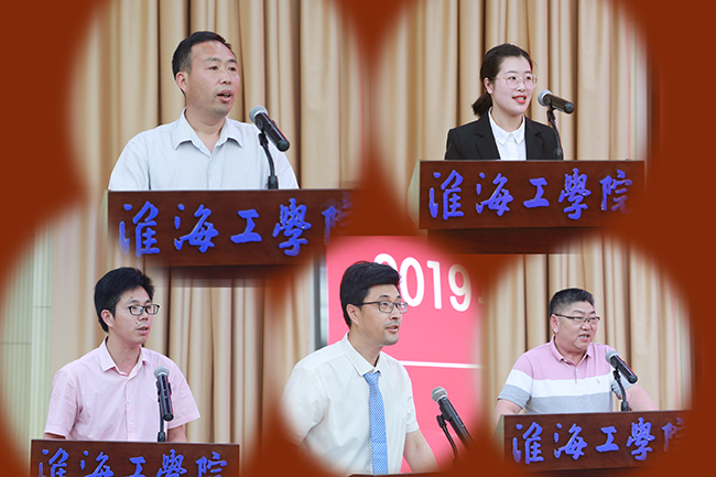 教务处处长李纪明宣读《关于表彰2018年学风建设先进单位、先进班级和先进个人的决定》,教学质量管理处处长吴明忠宣读《关于表彰2019年考研工作先进单位、优秀班级和先进个人的决定》,招生与就业处处长汤洪涛宣读《2019年度江苏省先进班集体、三好学生、优秀学生干部获奖名单》,学生工作处副处长张萍宣读《淮海工学院第七届大学生职业规划大赛获奖名单》。