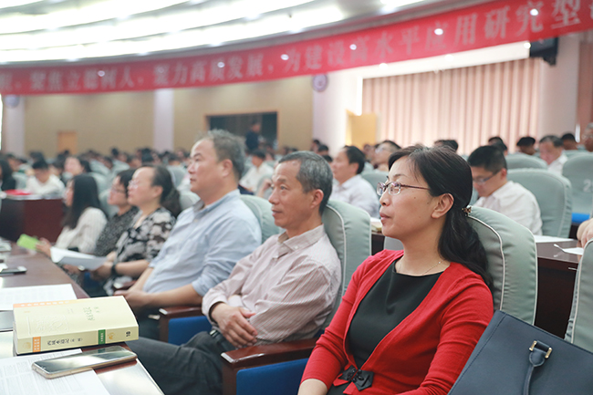 金芙蓉在讲话中总结回顾了我校2018年学风建设工作。她指出,2018年是我校大学更名冲刺年,学校以习近平新时代中国特色社会主义思想为指导,深入学习贯彻全国教育大会和新时代全国高等学校本科教育工作会议精神,坚持“以本为本”,推进“四个回归”。结合工作全局,学校打造学风建设“三大工程”,将学风建设工作系统化、常态化、精品化,抓实学风建设、培育优良学风,形成以教风带学风、以管理促学风、以环境育学风、以实绩显学风的学风建设工作新格局,全力培养德智体美劳全面发展的社会主义建设者和接班人。