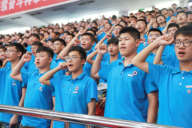 全体新同学将崭新的校徽佩戴在胸前,并在校学生会主席乔雪然的带领下庄严宣誓:秉承校风,谨遵校训;热爱祖国,忠于人民;志存高远,德才并重;情理兼修,勇于开拓;勤勉自强,敬业奉献;山容海纳,守正求新;强健体魄,热爱生活。