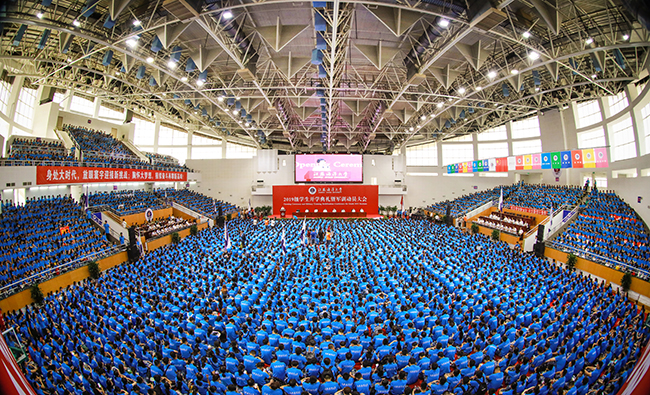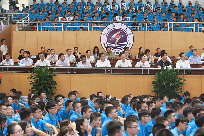 秋风送爽,丹桂飘香,初秋的校园到处洋溢着活力四射的青春气息。9月2日上午,苍梧校区体育馆里,五千多名身穿蓝色T恤的新生济济一堂,仿佛一片蓝色的海洋,我校2019级学生开学典礼在这里隆重举行。校领导王自力、宁晓明、史顺良、舒小平、许兴友、李梅英、陈先宏、严云洋出席了典礼。典礼由副校长李梅英主持。