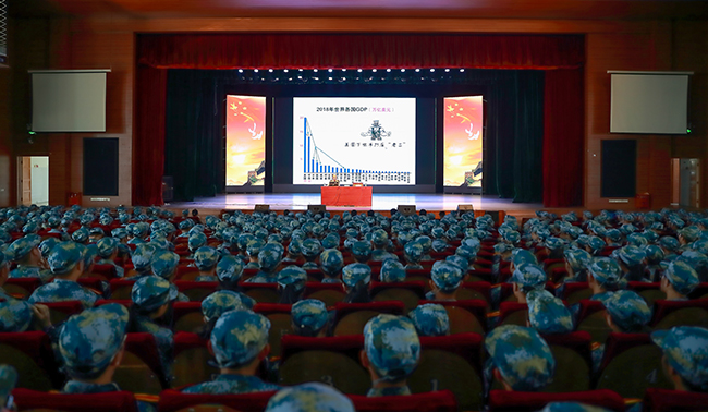 报告会上,黄培义少将结合详实的数据和丰富的资料系统介绍了世界格局的新变化,从多个维度列举了现阶段我国面临的巨大机遇与挑战,对中美两国的贸易摩擦进行了深入透彻的分析。黄培义指出,中美贸易摩擦,根本挡不住中国发展的脚步,以习近平同志为核心的党中央把握大势、运筹帷幄,中国经济发展前景更加光明。黄培义强调,新一代青年人要明辨是非,努力学习军事国防知识,不断增强国防意识,积极投身到国防实践中去。精彩的报告赢得了阵阵掌声,讲座结束时,全体师生更是自发起立向黄培义少将鼓掌致敬。