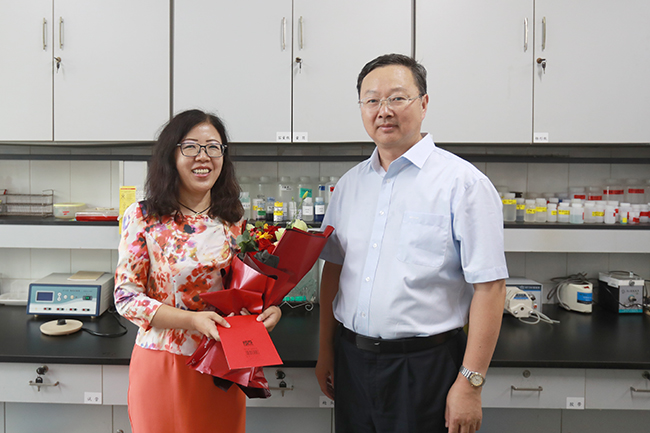 在海洋生命与水产学院实验室里,校长宁晓明鼓励段蕊老师与相关高校、科研院所、企业加强合作交流,积极拓宽研究生联合培养渠道。