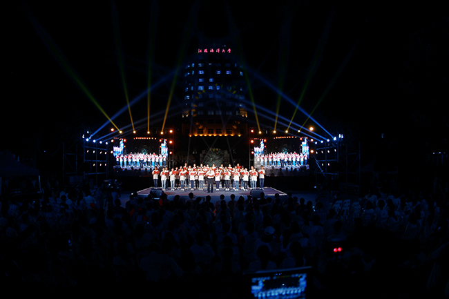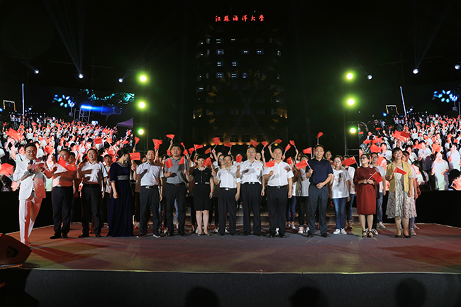 月映山川,情满江海。当晚的国旗广场前华灯高照,人头攒动,国旗挥舞,诗歌交汇。两块主题鲜明的高清大屏,流光溢彩的江苏海洋大学教学主楼,一起构成了诗歌会美轮美奂的舞台背景。屏幕上循环播放“不忘初心,砥砺前行”的纪录片,见证了新中国成立70周年以来的感动瞬间。“带领同学们进行一次特殊形式的爱国教育活动,让新生进校的同时,感受到学校的文化向心力。”文学院党委书记马建新、院长吴明忠共同表示。