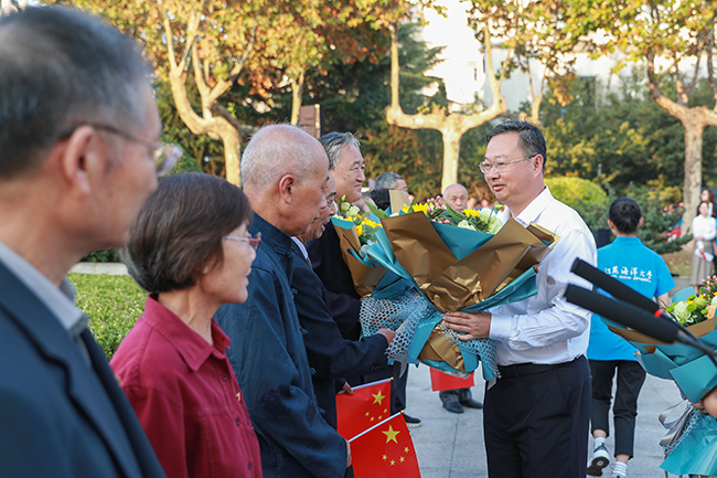 校长宁晓明向为我校建设和发展作出贡献、与新中国同龄的退休老同志代表献上鲜花。
