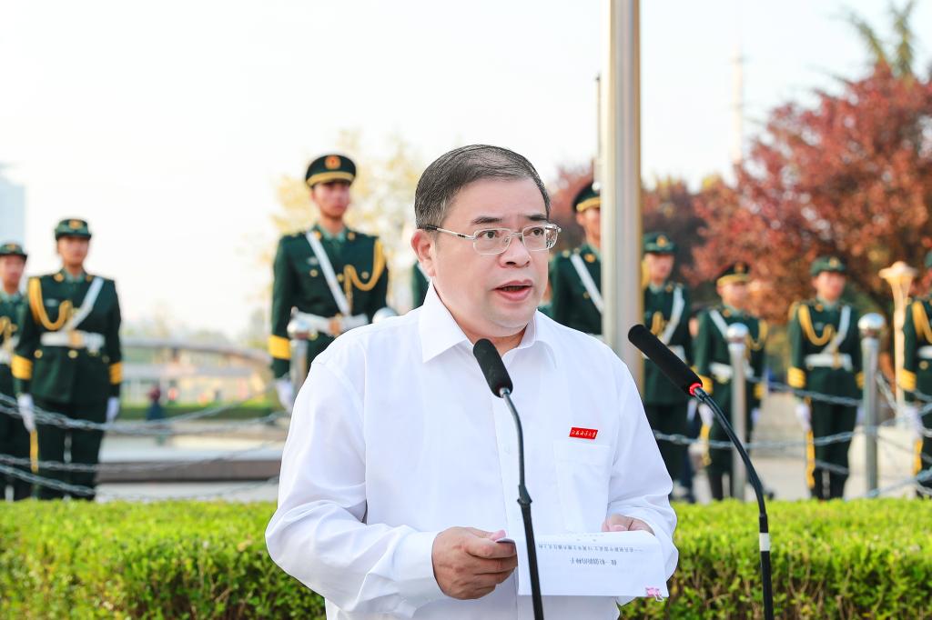 王自力在国旗下讲话。他指出,70年砥砺奋斗,我们的国家发生了天翻地覆的变化。无论是在中华民族历史上,还是在世界历史上,这都是一部感天动地的奋斗史诗。回首70年的艰辛探索,重温70年的光辉岁月,历数70年的辉煌成就,我们无比振奋,倍感自豪。