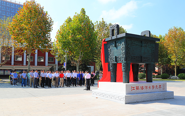 校长宁晓明、校友代表任瑜、浙江校友会名誉会长杨绍华共同为求实鼎揭幕。此次捐赠求实鼎是为了庆祝我校成功更名江苏海洋大学,该鼎由广东、上海、云南、昆山等9个校友会联合发起,地质8104、地质8103、选矿8102等128个班级的596名校友和10位老师捐赠。