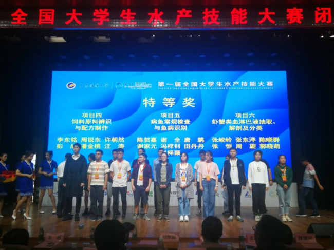 11月24日,从广东海洋大学传来喜讯,我校海洋生命与水产学院水产养殖学专业的六位同学在第一届全国大学生水产技能大赛中取得骄人成绩。其中,周锐东同学获得饲料原料辨别与配方制作项目特等奖、孙梦芹同学获得鱼类解剖与分类鉴定项目特等奖、黄永波同学获得养殖水体溶解氧检测项目一等奖、李润波同学获得浮游生物种类鉴定项目一等奖、谷昭天同学获得病鱼常规检查与鱼病识别项目一等奖,胡少秋同学获得虾蟹类血淋巴抽取、解剖及分类项目二等奖。