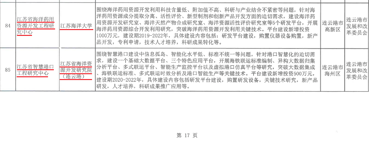 近日,江苏省发展和改革委员会下发了《江苏省发展改革委关于同意建设2019年江苏省省级工程研究中心的通知》(苏发改高技发[2019]1125号)文件,由我校牵头申报的“江苏省海洋药用资源开发工程研究中心”,由我校省海洋资源开发研究院牵头申报的“江苏省智慧港口工程研究中心”喜获立项建设,这标志着我校在海洋药用资源开发、智慧港口工程技术创新与研发有了更高平台,将有力促进有关学科专业高质发展。