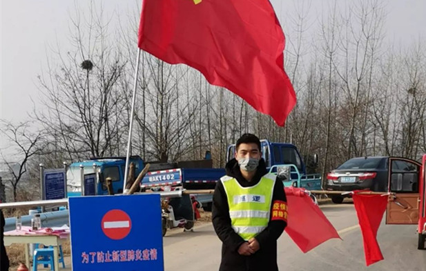 艺术学院学生赵学峰在村里主干道检查站执勤