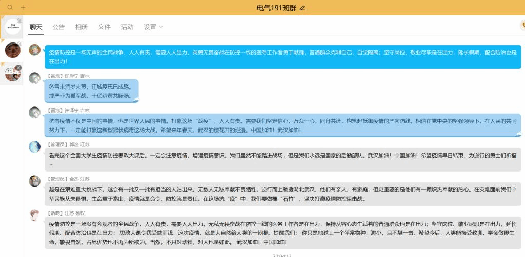 “亿万中华儿女万众一心,众志成城,共克时艰,战‘疫’路上的一个个‘好人’,一件件‘好事’走进我们的视野,他们的事迹感动着我们……”化学工程学院安工161班耿璐说。