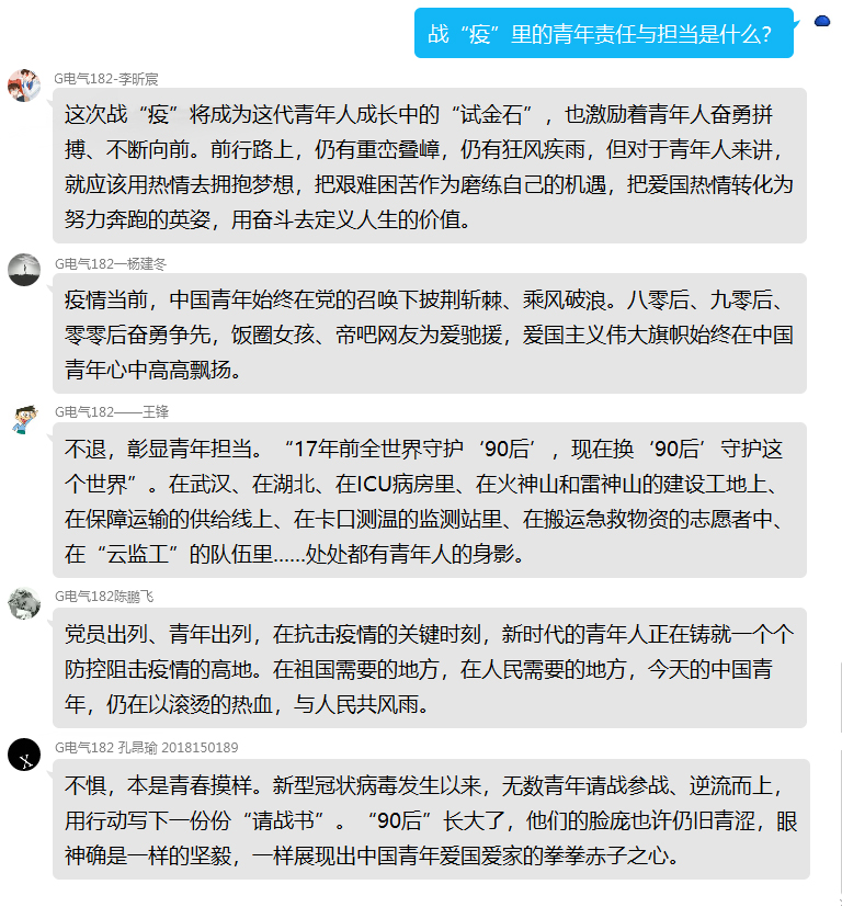 机械与海洋工程学院机电182班闫肃同学说,“面对疫情,全国各地、各行各业的青年纷纷写下‘请战书’,摁下鲜红的手印,用实际行动践行青春誓言。我们也要像他们一样脚踏实地、勇往直前,做新时代有理想、有道德、有文化、有纪律的有为青年!”