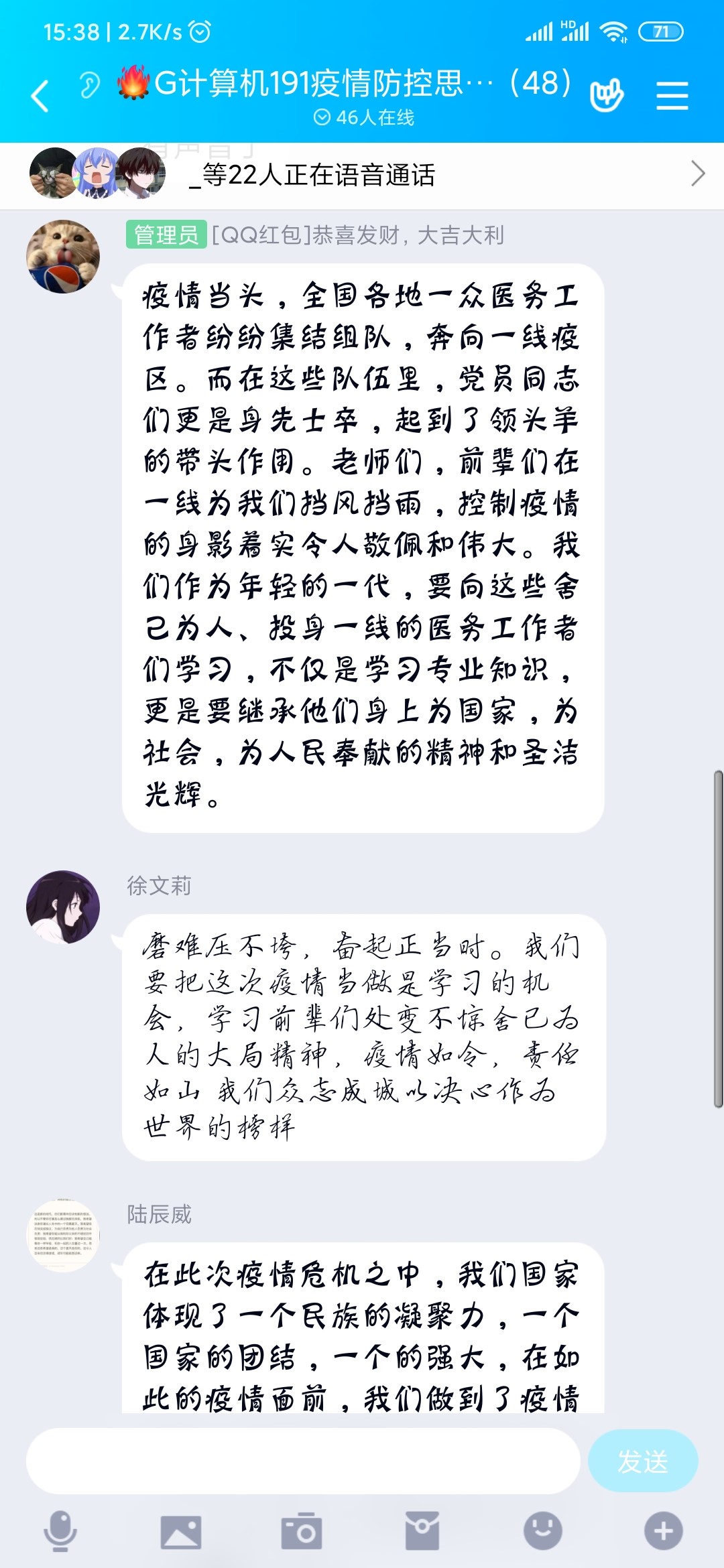“疫情发生以来,党员干部冲锋在前、守土尽责,医护人员迎难而上、救死扶伤,人民群众众志成城、捐款捐物。”法律与公共管理学院法学182班林慧表示,纵使我们每个人的力量如同小流,但只要团结起来也可汇成大江大海。