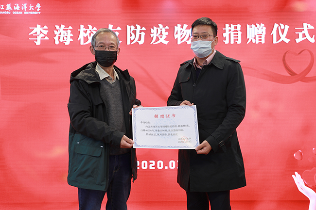 捐赠仪式上,金芙蓉副校长代表江苏海洋大学接受捐赠物资。此次李海校友共向母校捐赠额温枪8支、口罩40000只(先期到货6000只)、手套6000双、免洗酒精20箱。校友总会会长刘永强为李海校友颁发捐赠证书。